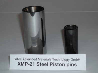 Besonders die Stahllegierung XMP-21 eignet sich für das Bauteil Kolbenbolzen. Diese Legierung verfügt über eine geringer Dichte sowie einen höheren E-Modul. Somit lassen sich Kolbenbolzen leichter und Steifer ausführen. Die sehr hohe Dauerfestigkeit ermöglicht eine weitere Gewichtsreduktion. Die Legierung verfügt zusätzlich über eine ausgezeichnete Verschleißbeständigkeit bei gleichzeitig guten tribologischen Eigenschaften. Die Kolbenbolzen sind bis zu 30% leichter als herkömmliche Stahlbolzen, bei höherer Steifigkeit.