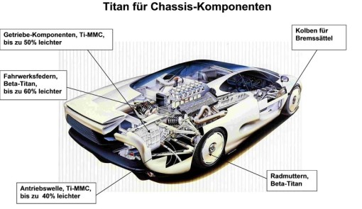 Im Augenblick werden im Chassisbereich vorwiegend drei Komponenten aus Titan hergestellt, Fahrwerksfedern, Abgasanlagen und Radmuttern bzw. – Bolzen.